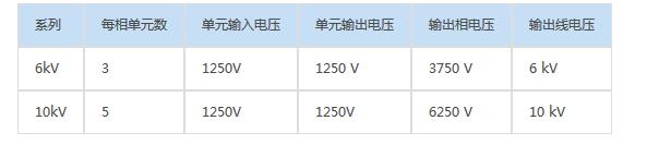 高壓電機節電系統根據電機額定電壓的不同,功率單元柜每相所串聯的個數也不同,6KV,10KV電壓與功率單元關系如下: