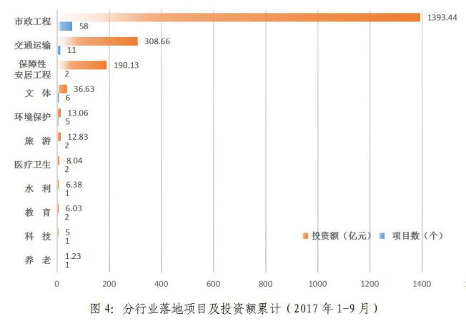 2017年1-9月,累計新落地項目數排名:市政工程(58個)、交通運輸(11個)、文體(6個)、環(huán)境保護(5個)、保障性安居工程(2個)、醫(yī)療衛(wèi)生(2個)、教育(2個)、旅游(2個)、養(yǎng)老(1個)、水利(1個)、科技(1個)。