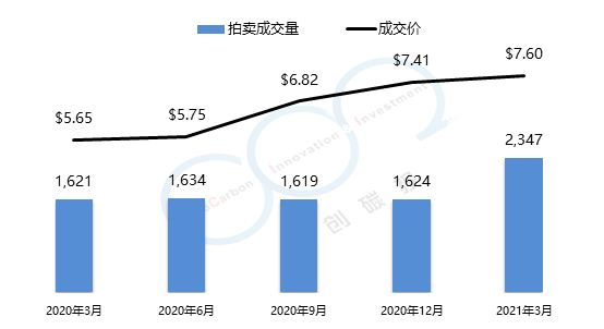 RGGI碳市場的初始配額發放以拍賣為主,每個季度舉行一次拍賣。2021年第一季度拍賣成交均價為$7.60美元,較上一季度漲幅為2.5%。由于弗吉尼亞州的加入,RGGI總成交量創歷史新高,達到了2347萬噸。以下是由中創碳投統計的RGGI近一年的交易情況。