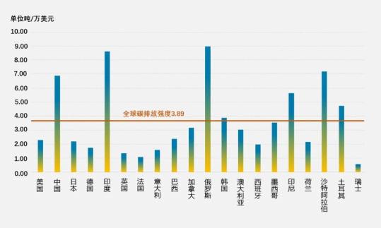2019年全球GDP前20名國家的碳排放強(qiáng)度