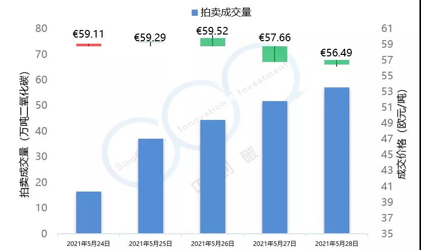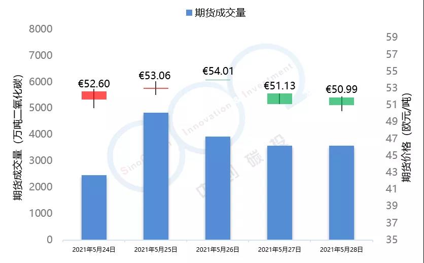 數(shù)據(jù)說明:期貨成交量為ICE-EUA期貨成交量,拍賣成交量為EEX-EUA拍賣成交量,歐盟碳價(jià)為ICE期貨成交結(jié)算價(jià)(連續(xù))