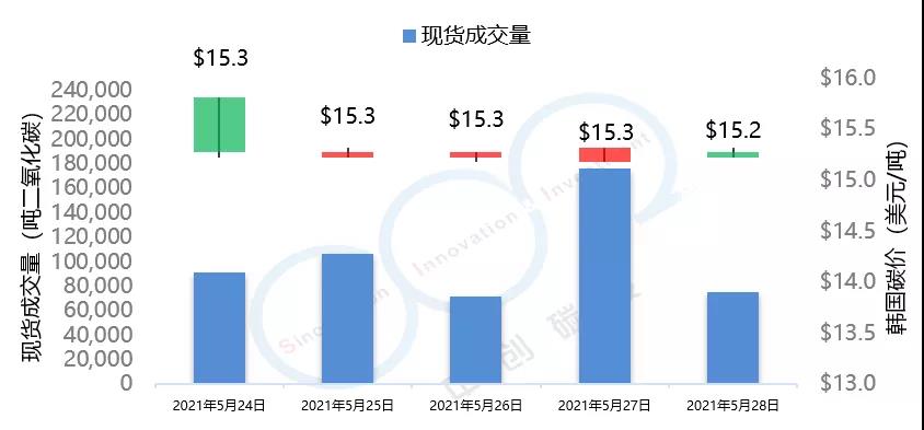 2021年5月24日至5月28日,本周韓國碳價(jià)延續(xù)上周的下跌趨勢,由15.3美元/噸下跌至15.2美元/噸。本周韓國碳市場成交量達(dá)到52萬噸,遠(yuǎn)高于上周7萬噸的水平。