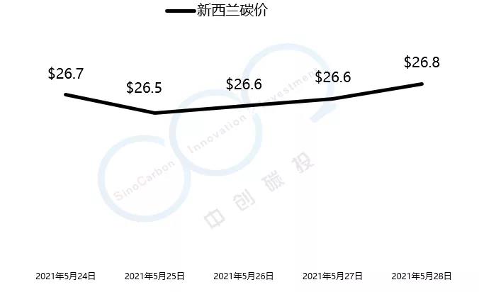 2021年5月24日至5月28日,新西蘭碳價(jià)本周由26.7美元/噸小幅漲至26.8美元/噸。