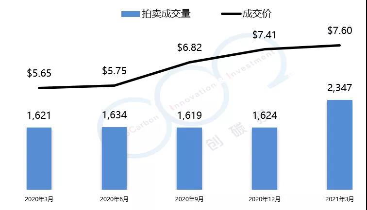 RGGI碳市場的初始配額發(fā)放以拍賣為主,每個(gè)季度舉行一次拍賣。2021年第一季度拍賣成交均價(jià)為$7.60美元,較上一季度漲幅為2.5%。由于弗吉尼亞州的加入,RGGI總成交量創(chuàng)歷史新高,達(dá)到了2347萬噸。以下是由中創(chuàng)碳投統(tǒng)計(jì)的RGGI近一年的交易情況。