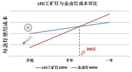 從短期看,金鹵燈的投入比LED工礦燈少。從長期看,LED工礦燈是一種更環保、節能的綠色照明產品,而且不到1年的時間內將收回全部投入。
